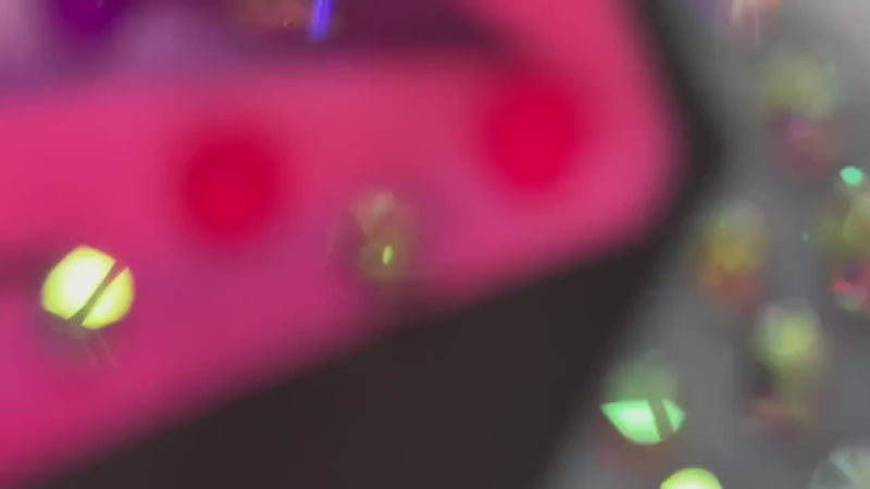 Justaucorps rythmique dans des tons fuchsia et néon avec transparences, strass et motifs symétriques créant un look dynamique et lumineux.