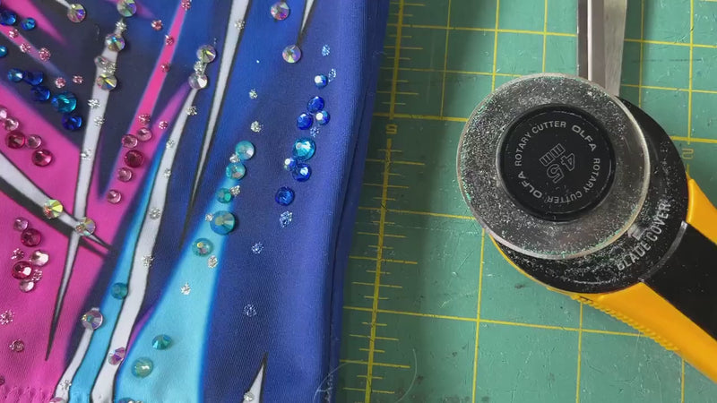 Justaucorps rythmique en bleu profond et néon, strass dispersés, transparences latérales et style frontal ondulé au fini lumineux.